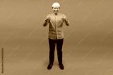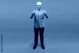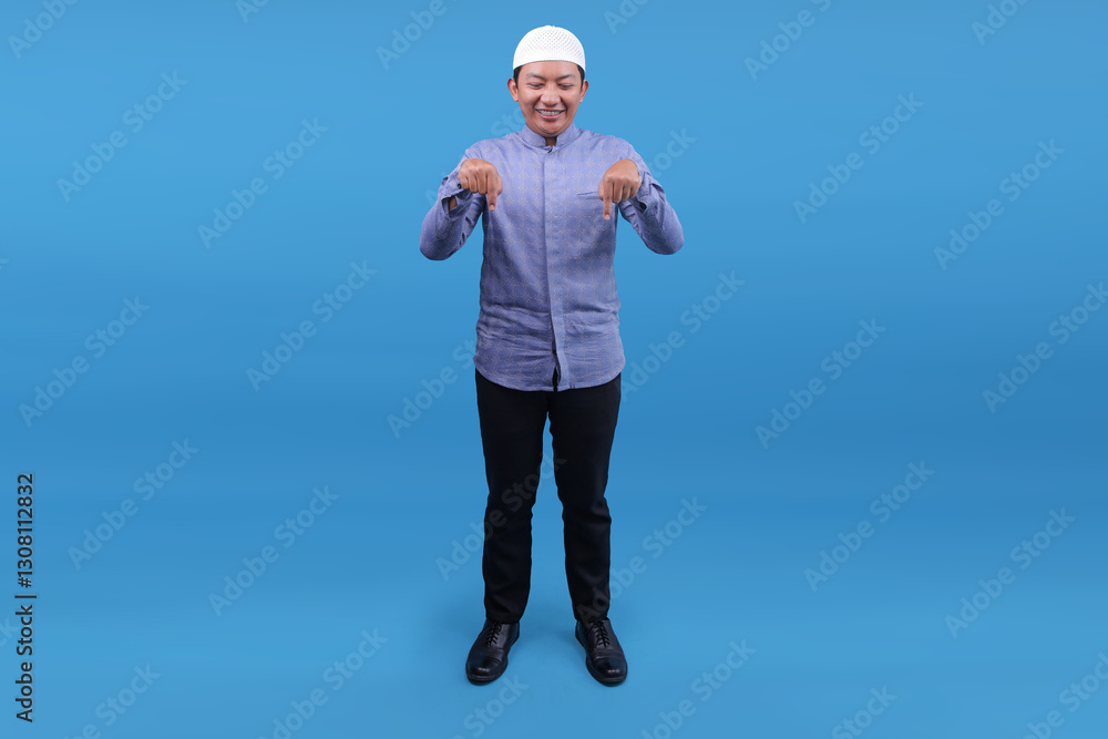 Full Length Shot Of Young Muslim Man Looking and Pointing Down Isolated On Blue Background