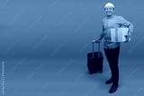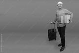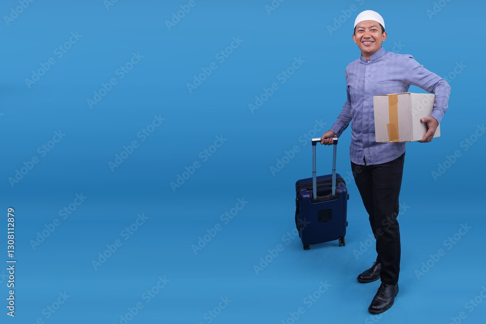 Young Asian Muslim Man Dragging Suitcase And Carrying Package Over Blue Background
