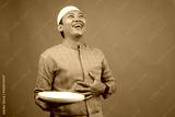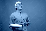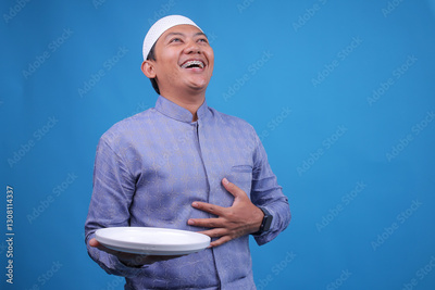 Portrait Of Young Muslim Man Holding Empty Plate Touching Stomach Feeling Full Over Blue Background