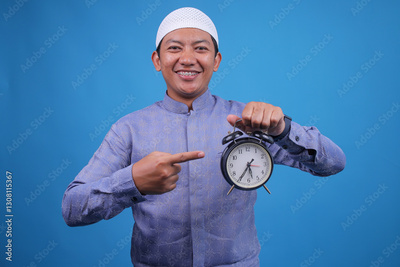 Smiling Young Muslim Man Pointing At Alarm Clock Showing Iftar Time Over Blue Background