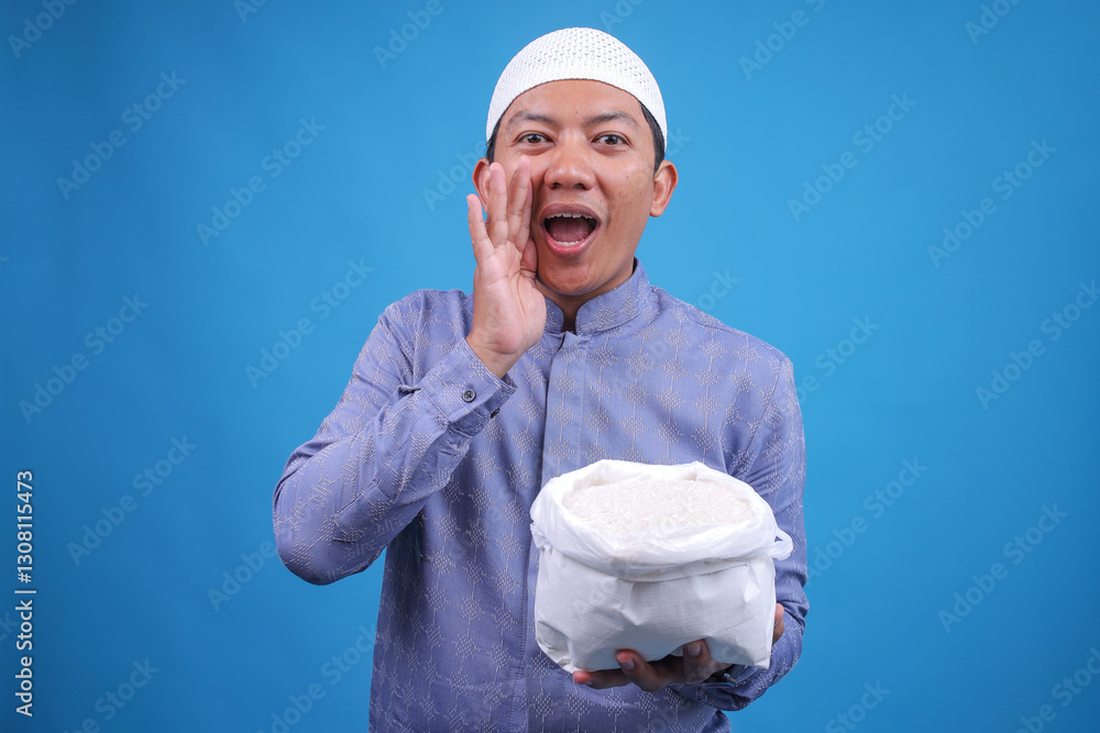 Portrait Of Muslim Man Gesture Announcing While Holds Rice Grain To Remind Zakat On Blue Background