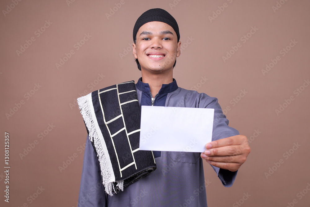 Cheerful Young Muslim Male Showing Envelope To Front For Eid Gift Isolated On Beige Background