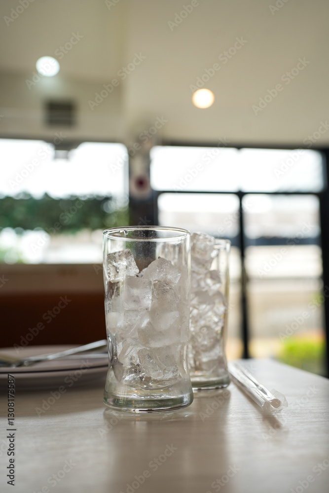 Clear ice cubes filled full in a glass on the table in restaurant. Selective focus
