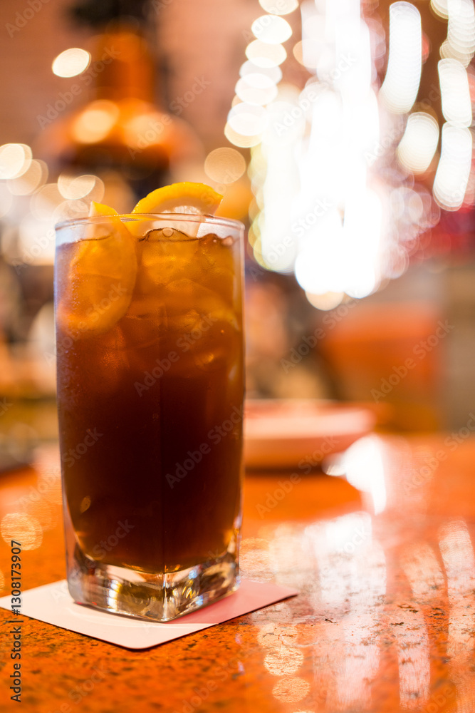 Iced tea with lemon and ice in a tall glass on a bokeh background.