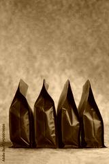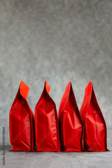 Coffee beans and caffeine related beverage zip lock pouch mockup, a row of red coffee bag