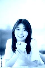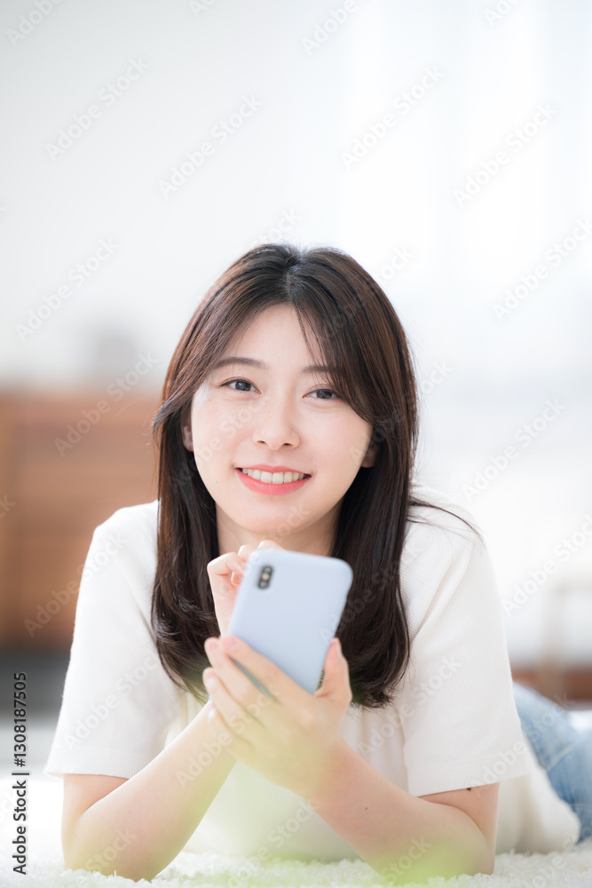 部屋でうつ伏せでスマホを見る若い女性のクローズアップ 春夏の半袖カメラ目線の縦