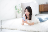 部屋でうつ伏せでスマホをタップする若い女性の春夏の半袖の広角で全身
