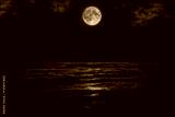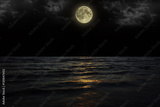 Beautiful magic blue night sky with clouds and full moon stars reflexion in water