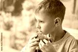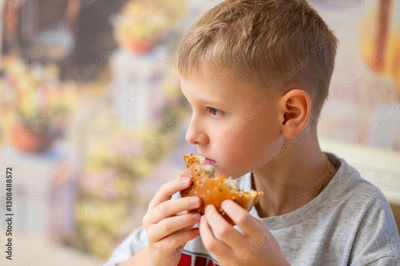 A young boy enjoys a delicious burger, taking a big bite. He holds the sesame seed bun with both hands, savoring the taste. The blurred background adds warmth and coziness to the scene.