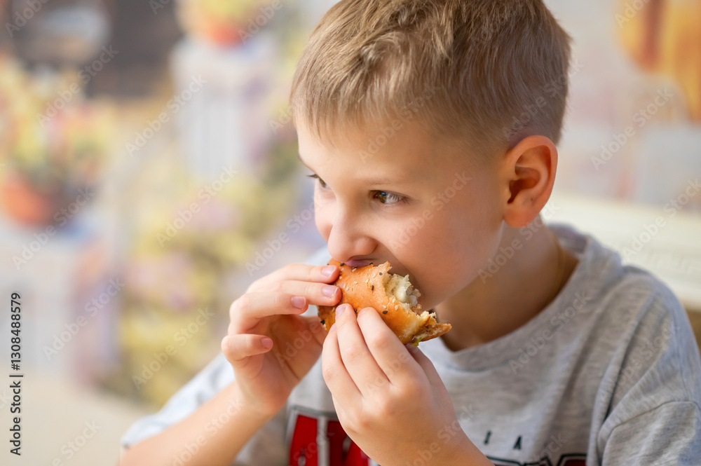 A young boy enjoys a delicious burger, taking a big bite. He holds the sesame seed bun with both hands, savoring the taste. The blurred background adds warmth and coziness to the scene.