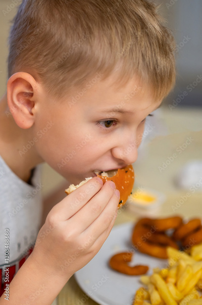 A young boy enjoys a meal, taking a bite of his burger while focusing on his food. His plate is filled with fries and onion rings.