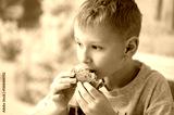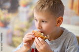 A young boy enjoys a delicious burger, taking a big bite. He holds the sesame seed bun with both hands, savoring the taste. The blurred background adds warmth and coziness to the scene.