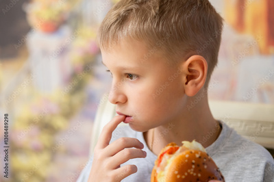 A young boy with short blond hair enjoys a delicious burger, taking a big bite. He holds the sesame seed bun with both hands, savoring the taste.