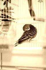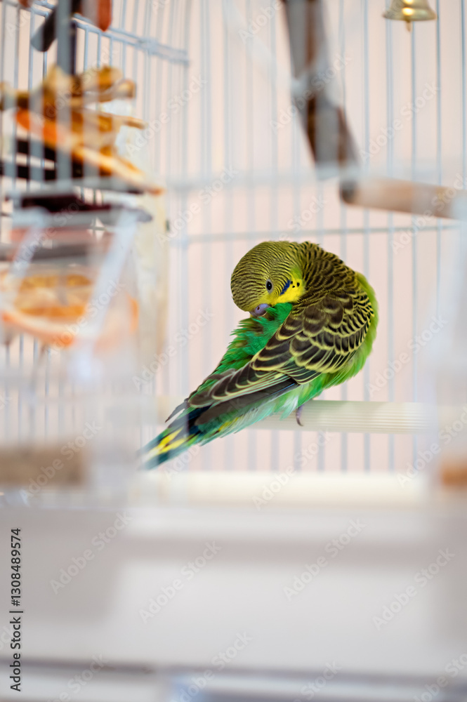 Green and yellow budgerigar preening its feathers inside a cage. Close-up of a pet parrot taking care of its plumage. Selective focus, home bird care, and avian grooming concept.