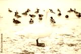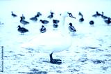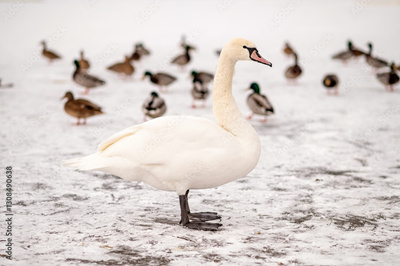 Majestic white swans stand among a flock of ducks on a frozen lake in winter. The contrast of bright white swan and colorful mallards creates a serene seasonal wildlife scene.
