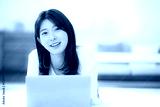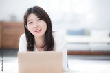 うつ伏せでパソコンで検索する女性 自宅でオンラインで勉強などのイメージ カメラ目線