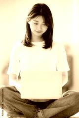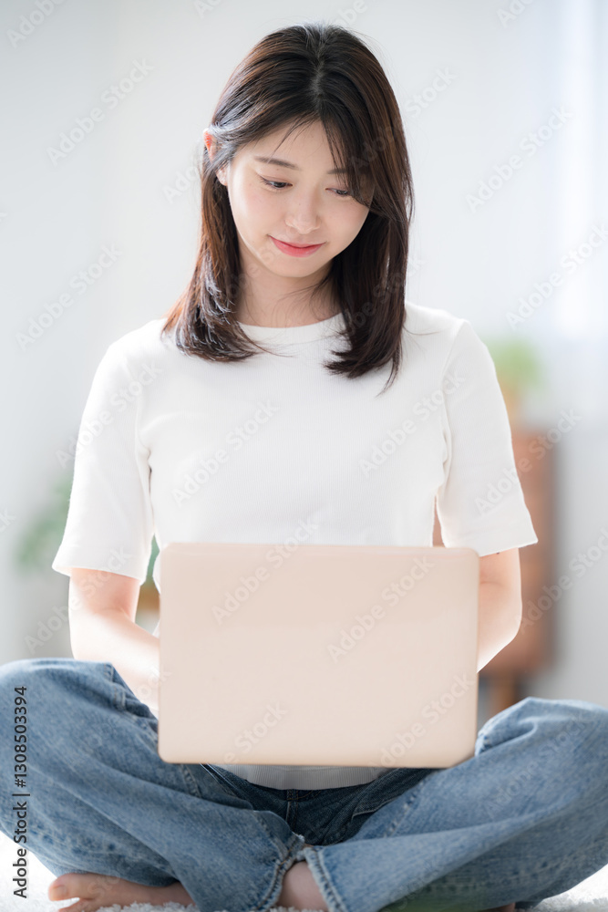 リビングでカジュアルな服であぐらでパソコンをする若い女性