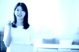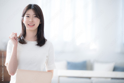 リビングでカジュアルな服でパソコンをする若い女性 カメラ目線のガッツポーズ