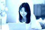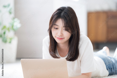 Woman searching on computer in prone position Image of studying online at home, etc.