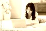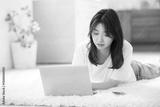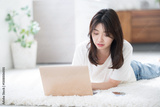 うつ伏せでパソコンで検索する女性 自宅でオンラインで勉強などのイメージ