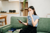 Young asian woman relax on comfortable couch at home texting messaging on smartphone and tablet