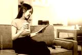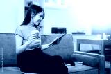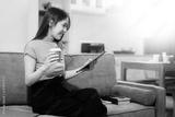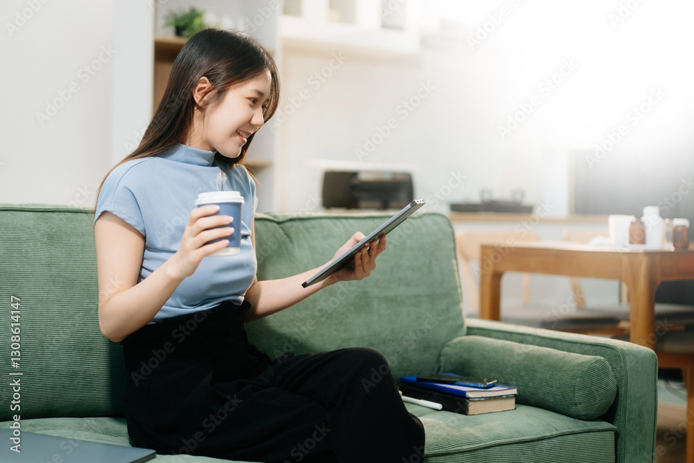 Young asian woman relax on comfortable couch at home texting messaging on smartphone and tablet