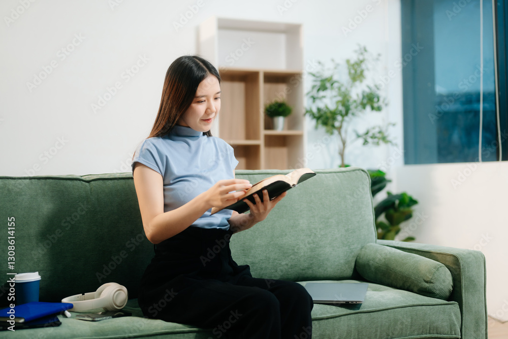 Asian woman using the smartphone and tablet on the sofa at home.