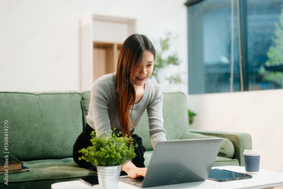 Young asian woman relax on comfortable couch at home texting messaging on smartphone and tablet