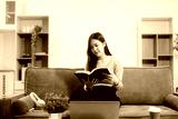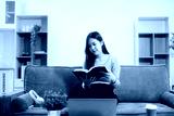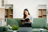 Young Asian woman listening music from headphones and writing note for her work idea in diary book.She in home