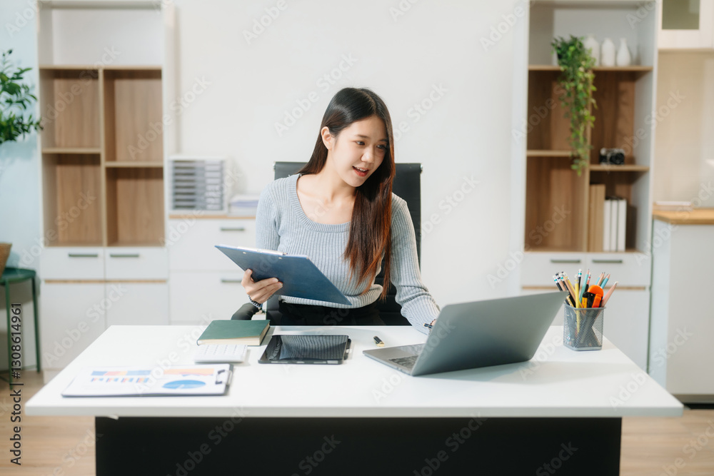 Young attractive Asian woman smiling thinking planning writing in notebook, tablet and laptop working from home