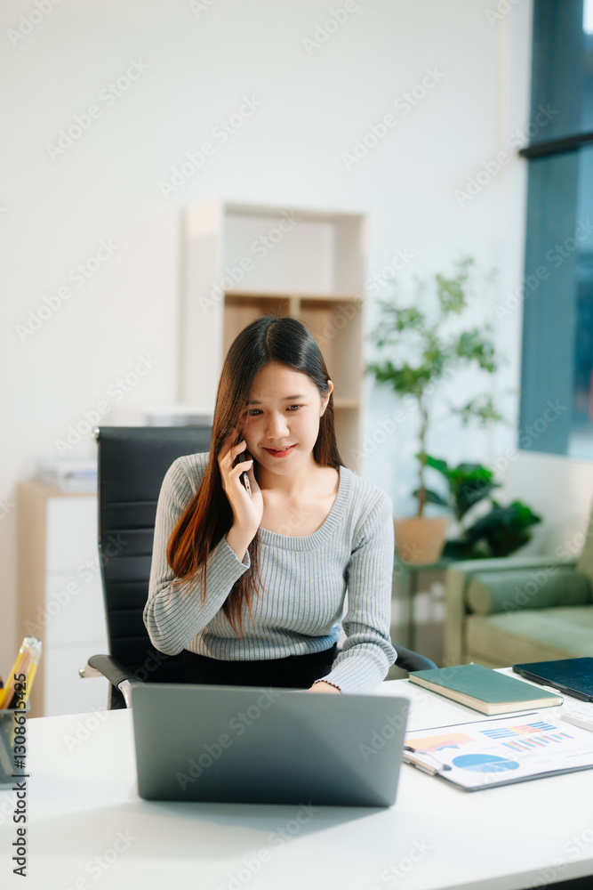 Asian Businesswoman Analyzing Finance on Tablet and Laptop at modern Office Desk