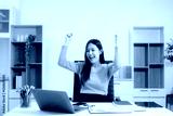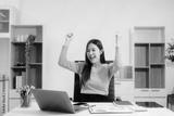 Young beautiful woman typing on tablet and laptop while sitting at the working white table