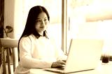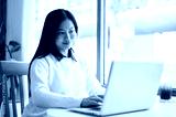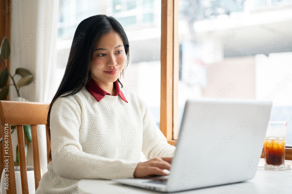 A smiling asian woman is typing and looking intently at the laptop screen. Working or study in cafe.