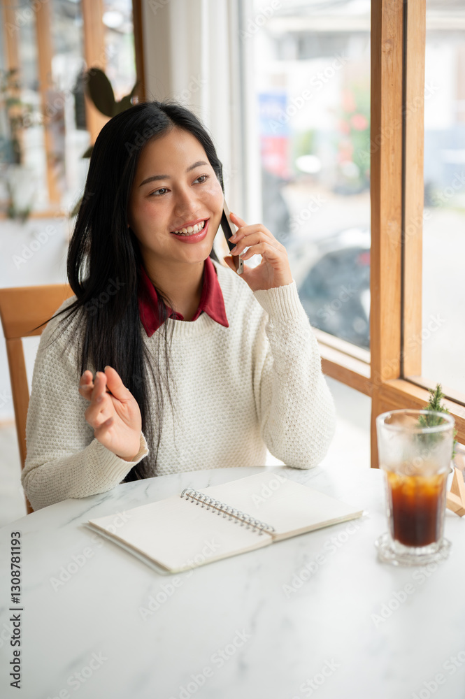 An asian woman is smiling while talking on the phone, sitting at the marble table in the cafe.