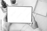 The left hand holding blank screen tablet horizontally with stylus pencil in right hand on the table