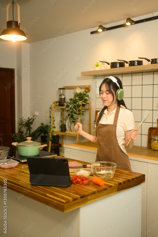 Cheerful young woman wearing an apron and headphones enjoys cooking in a modern kitchen