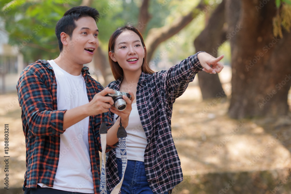 Tourists exploring park with vintage camera, woman pointing at something interesting