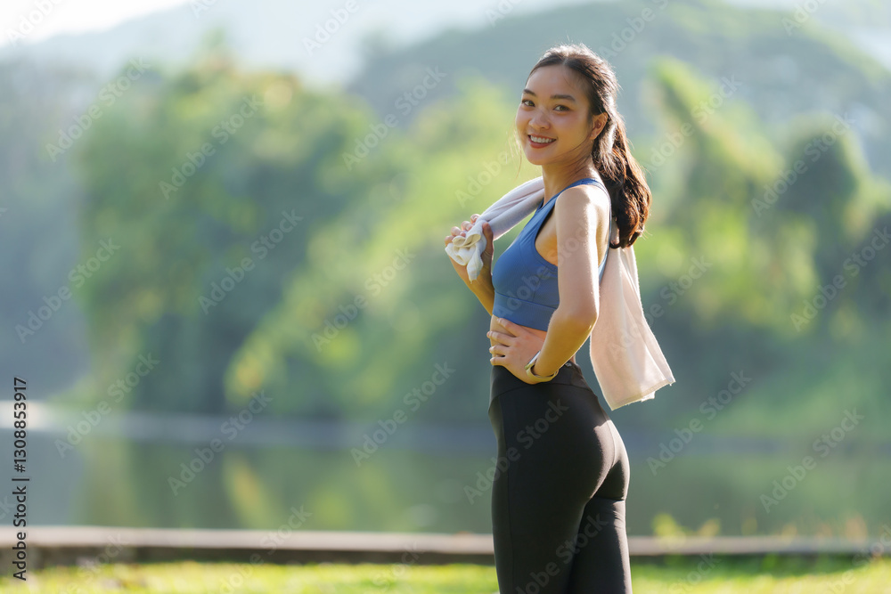 Young asian sportswoman relaxing by the lake in a public park, enjoying the sunny summer morning with a towel draped over her shoulders, embodying a healthy and active lifestyle
