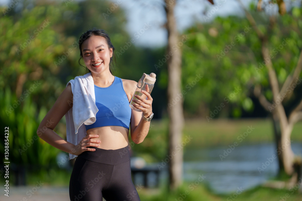 Young asian woman wearing sportswear and holding a water bottle is smiling after her workout in a park, promoting a healthy and active lifestyle