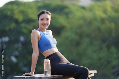 Young asian sportswoman resting on a bench after an intense training session, happily drinking water from a bottle, surrounded by lush green trees in a serene park setting