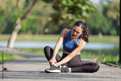 Young sporty asian woman is sitting on the ground and holding her ankle in pain after suffering an injury while exercising outdoors in a park