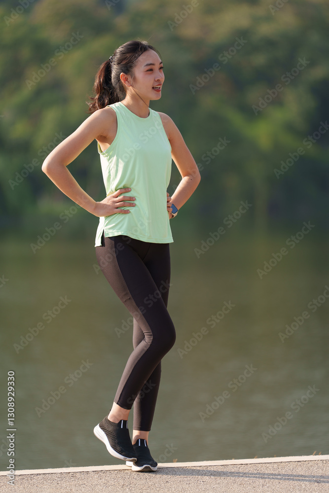Young woman in athletic wear stretching by a scenic lakeside path. She appears focused and ready for a workout, with lush greenery in the background enhancing the tranquil setting