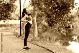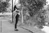 Young woman stretches beside a scenic lakeside path, wearing athletic gear and headphones. The serene environment highlights her focus on fitness and relaxation in nature