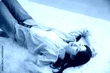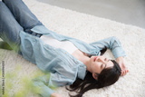 部屋で仰向けで寝転ぶ目を閉じるくつろぐ若い女性の俯瞰 リラックスやお昼寝 広角