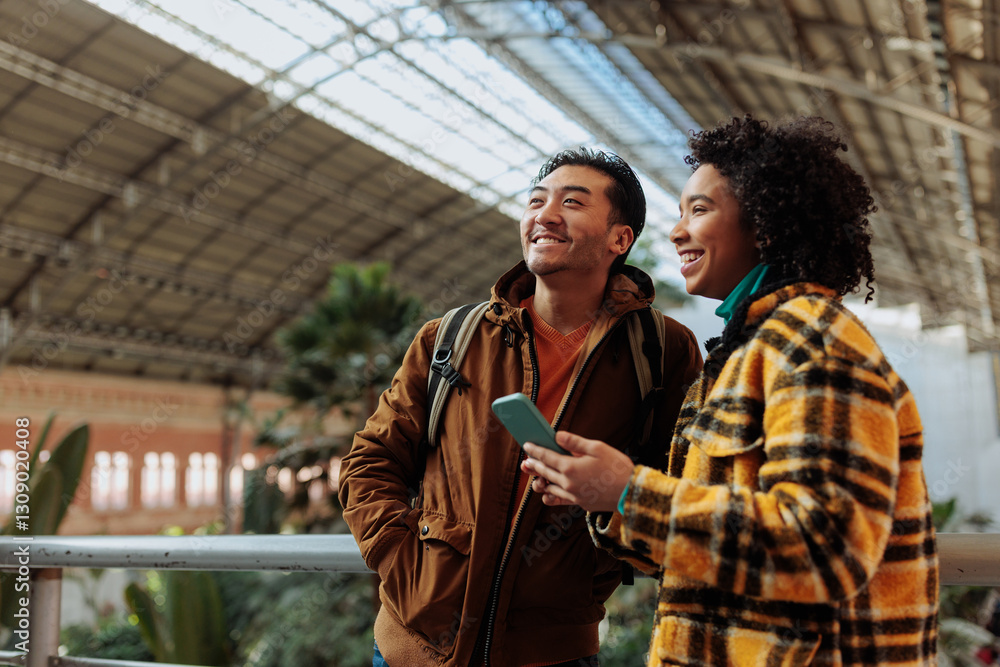 Tourists consulting smart phone inside railway station in madrid