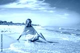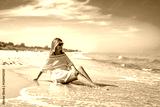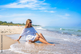Beautiful middle aged woman sitting on seashoreon white sandy beach in summertime. Side view