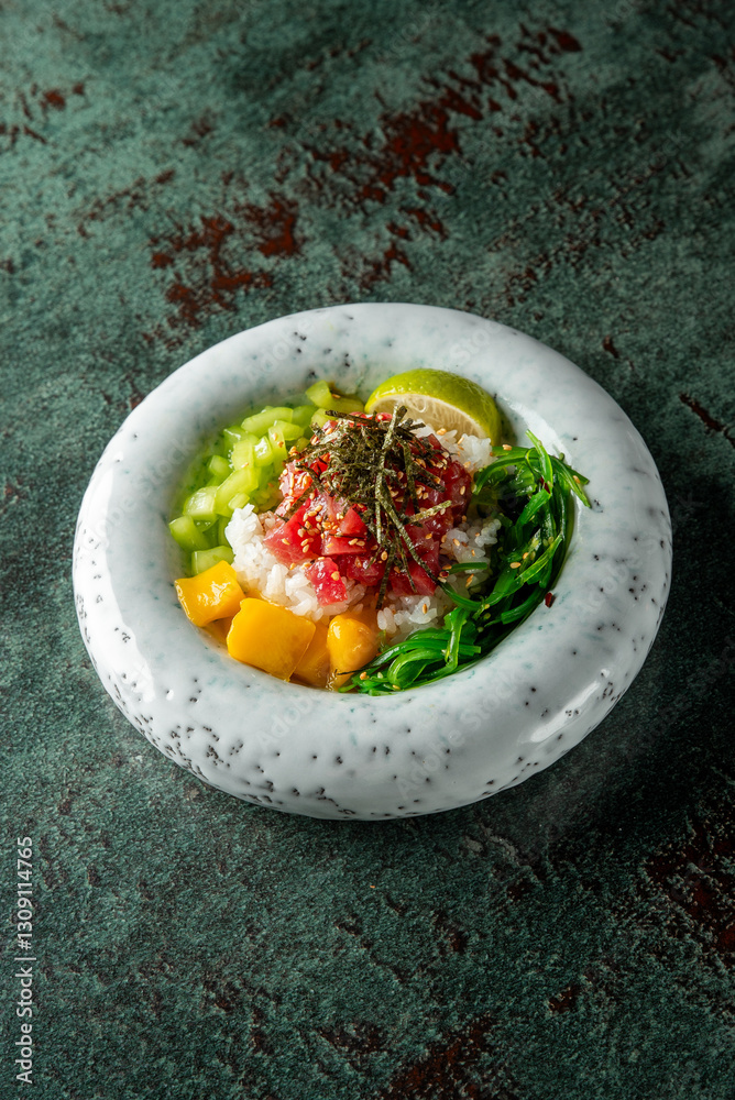 A beautifully arranged bowl of sushi rice topped with fresh tuna, mango, seaweed, cucumbers, and lime. The dish is garnished with sesame seeds and herbs, showcasing vibrant colors.