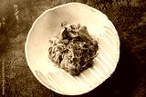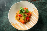 A delicious plate of pasta featuring cherry tomatoes, herbs, and sesame seeds, elegantly presented in a textured ceramic bowl against a rustic background.
