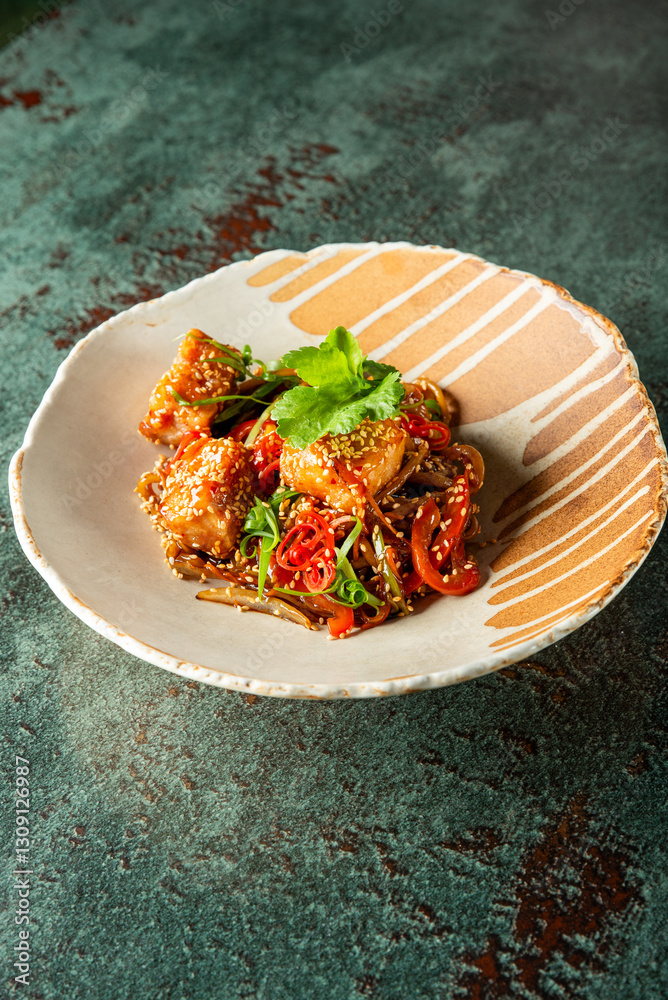 A delicious bowl of stir-fried noodles topped with colorful vegetables, sesame seeds, and fresh coriander, presented on a textured ceramic plate.