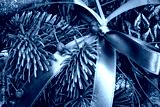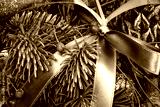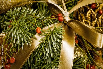 Christmas decoration background, golden ribbon on xmas tree closeup, concept of Happy New Year, decor, merry.